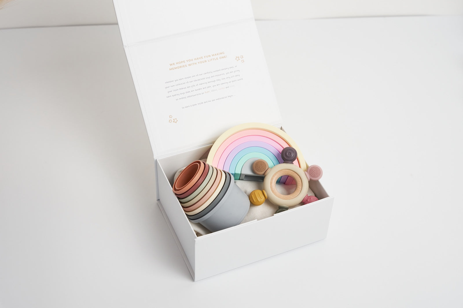 Each piece is thoughtfully sized for little hands and crafted to support developing motor skills while sparking joyful interaction. Presented in one of our signature gift boxes, this versatile set makes a beautiful and practical gift for baby showers, first birthdays, or everyday playtime adventures.